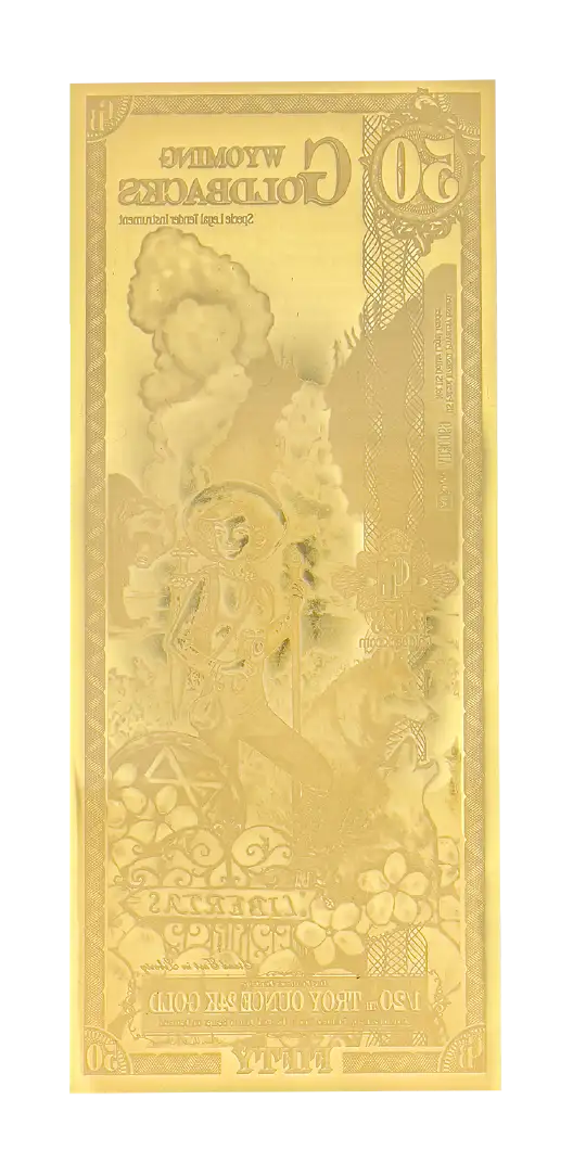 The Goldback Wyoming series features beautifully designed gold notes that celebrate Wyoming's rich cultural and natural heritage. Each denomination in the series showcases unique artwork highlighting virtues, historical narratives, and symbols deeply rooted in Wyoming's identity, such as reverence for nature, the significance of native wildlife, and the state's majestic landscapes. Through intricate designs, the series pays homage to the spirit of Wyoming, blending artistic creativity with tangible value in gold, offering a collectible and practical form of currency that honors the state's legacy and values.