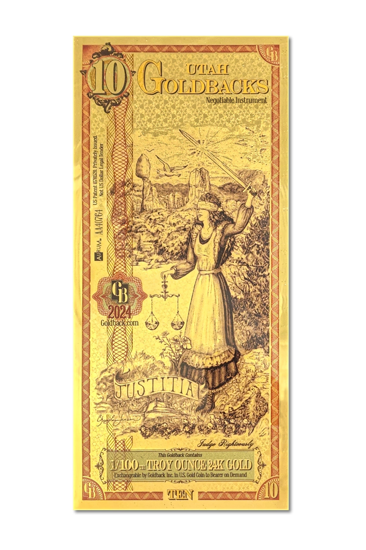 Ten Goldbacks. Ten milligrams of .9999 fine 24k gold. One note. The...