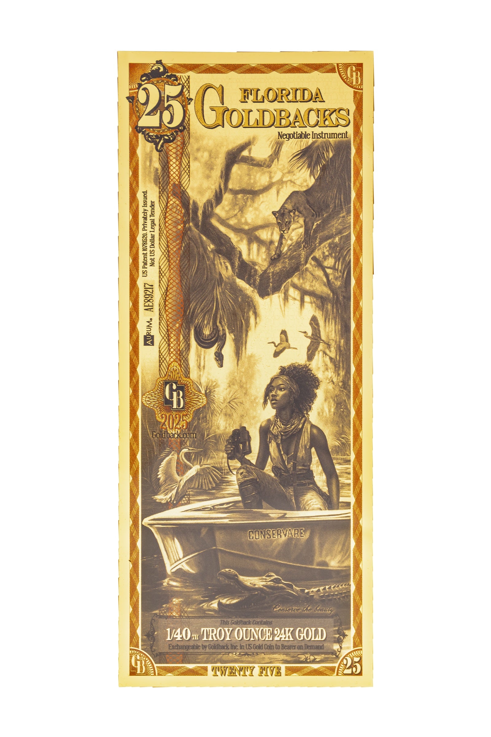 The Florida 25 Goldback features Conservae, the virtue of Conservation, set deep in the Florida Everglades. A Florida Panther rests in a tree above as Conservae scans the horizon with binoculars from her boat below, a native heron at her side and an alligator drifting in the water nearby. A python hangs from a branch in the background, not as spectacle but as a reminder of what is at stake when ecosystems fall out of balance. Every element is deliberate: the Everglades as one of Earth's most extraordinary and fragile places, and the people committed to keeping it that way. Inscribed in the artwork: "Conserve the beauty."