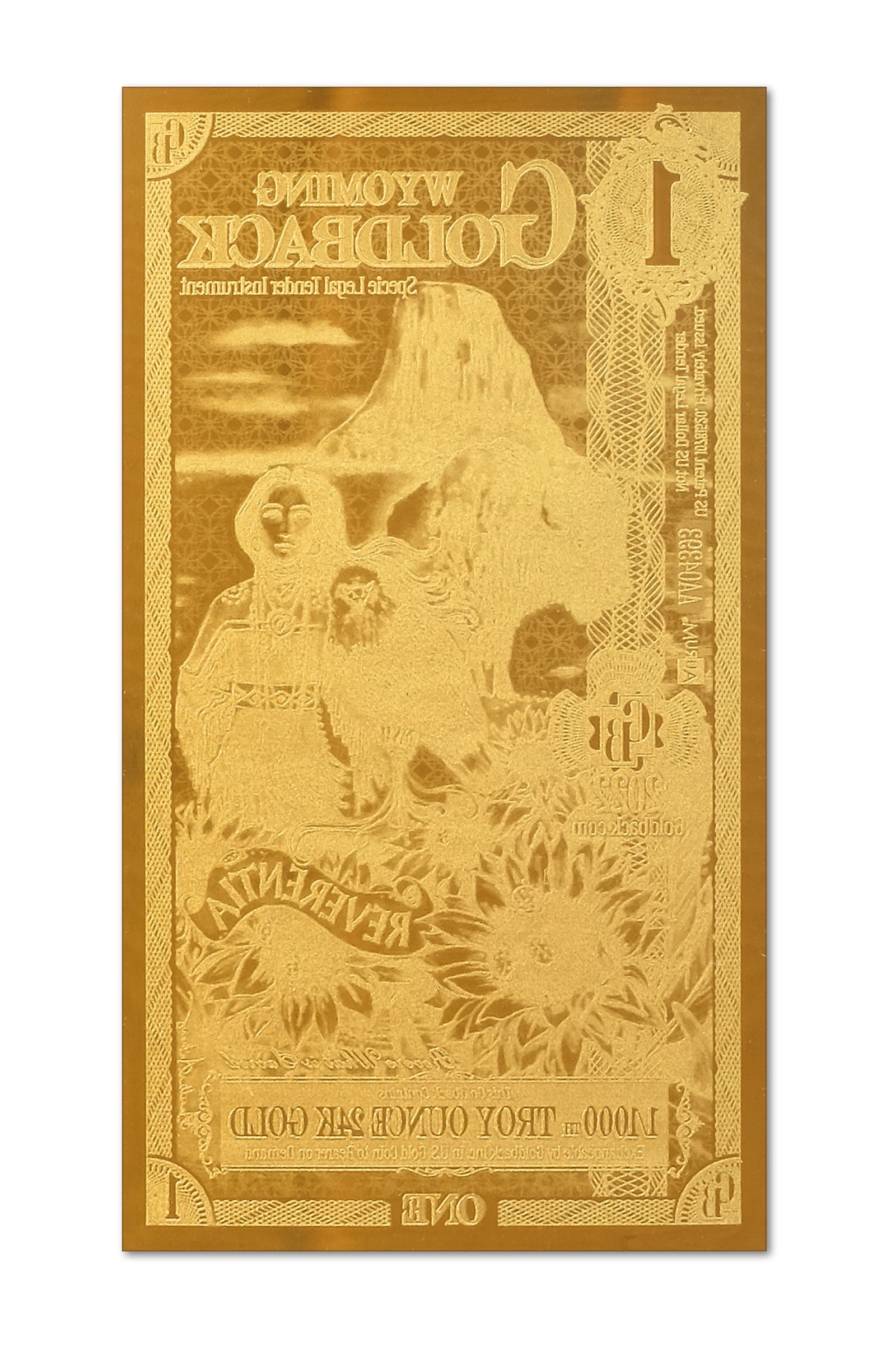 ¡Eleva tu colección con el cautivador Troy OZ Goldback 1/100 de Wyoming! 🦅 Reverentia, la encarnación de la reverencia y el respeto, adorna esta exquisita nota de oro, capturando la esencia de la tradición y la espiritualidad.