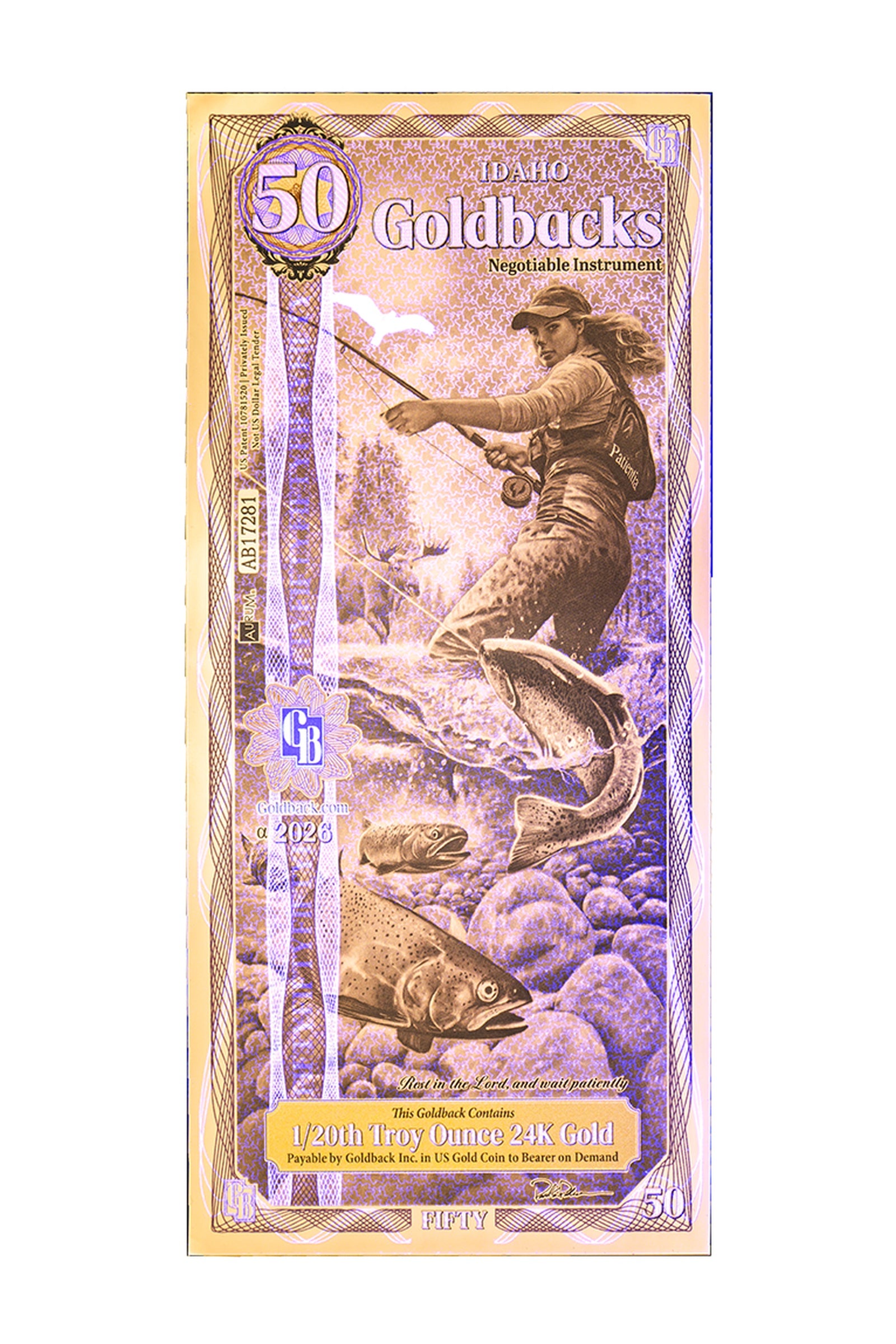 The Idaho 50 Goldback is one of the most substantial single notes in the series — 1/20 of a troy ounce of .9999 fine 24k gold, hand-drawn by artist Paul Pederson. Each denomination in the Idaho series honors a different virtue and a different chapter of the Gem State's outsized history. Full artwork details will be revealed at launch on March 24, 2026.