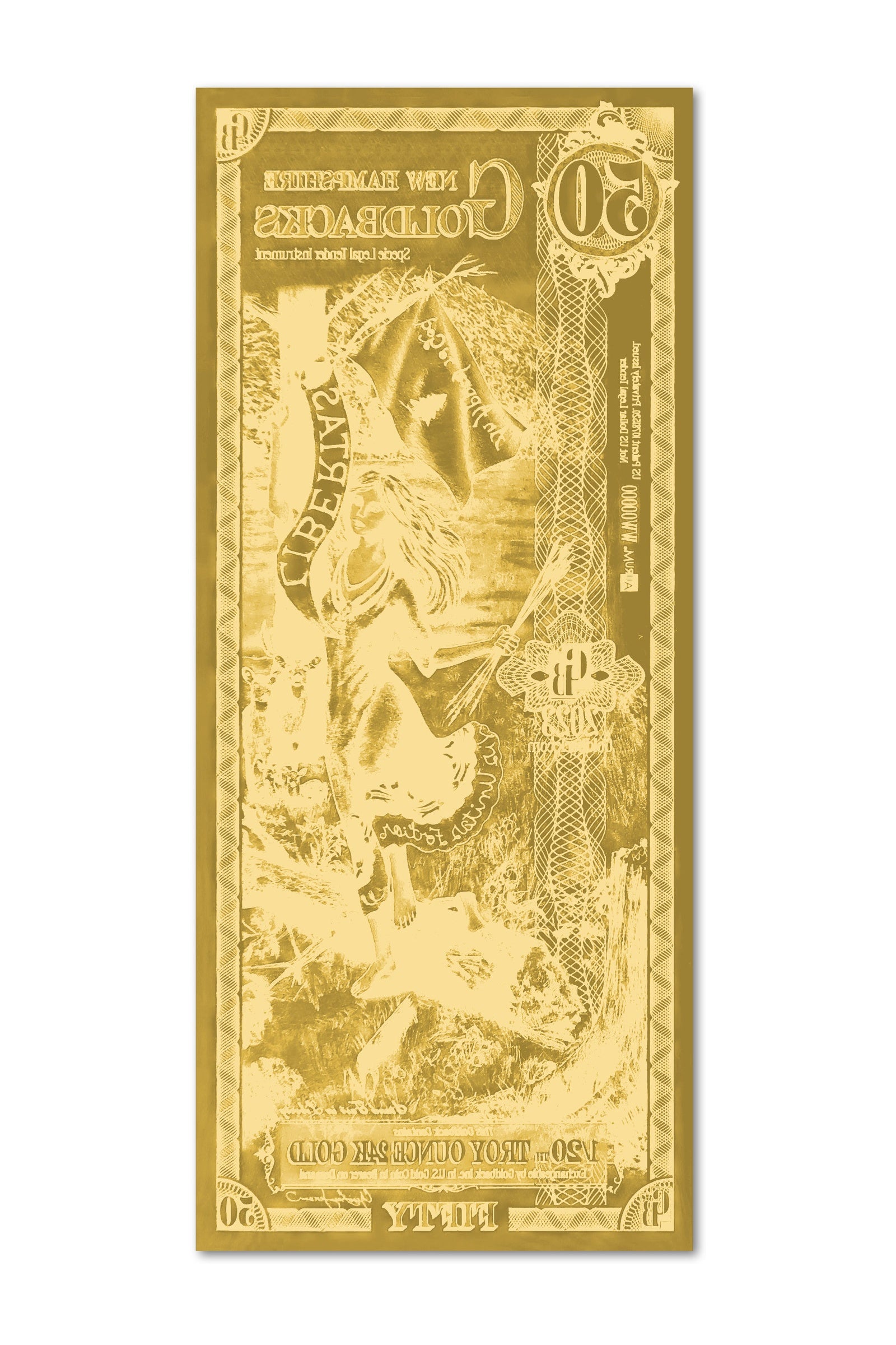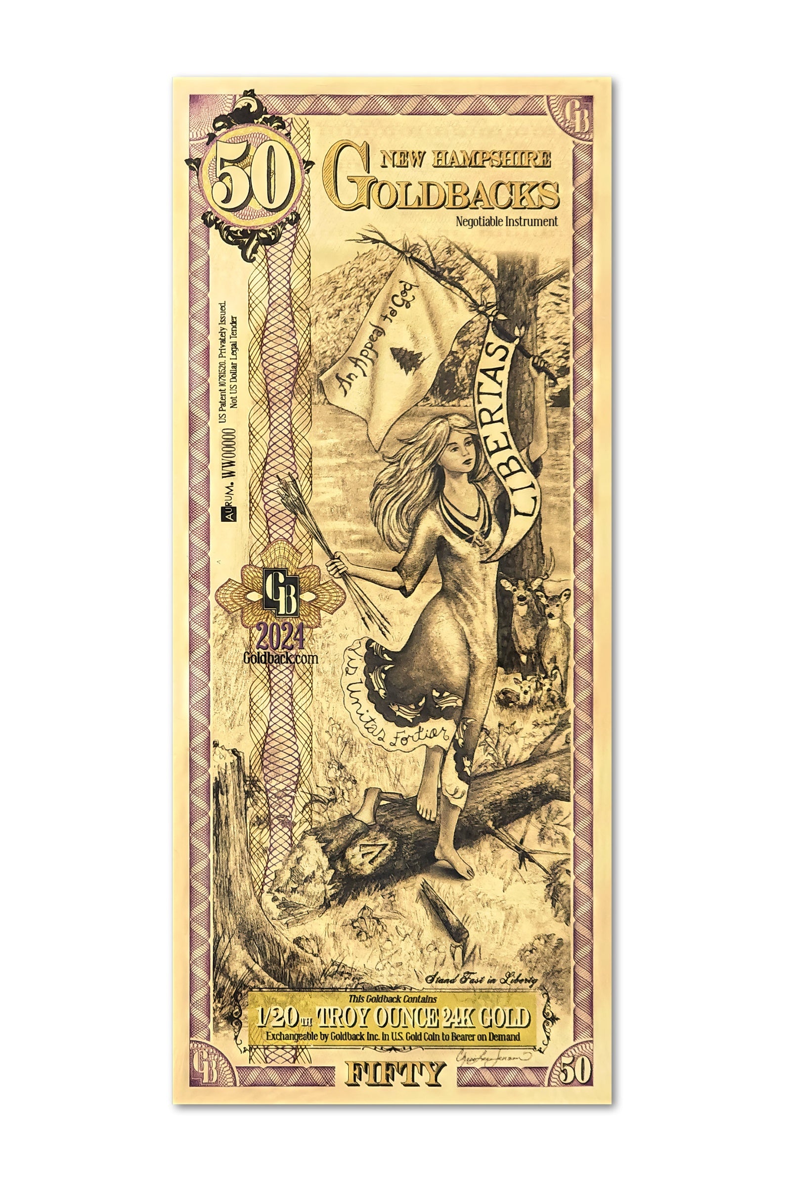 Una vez más, Libertas , o Libertad, adorna el diseño de denominación Goldback 50 de New Hampshire, y se erige como un símbolo duradero de libertad y unidad.
