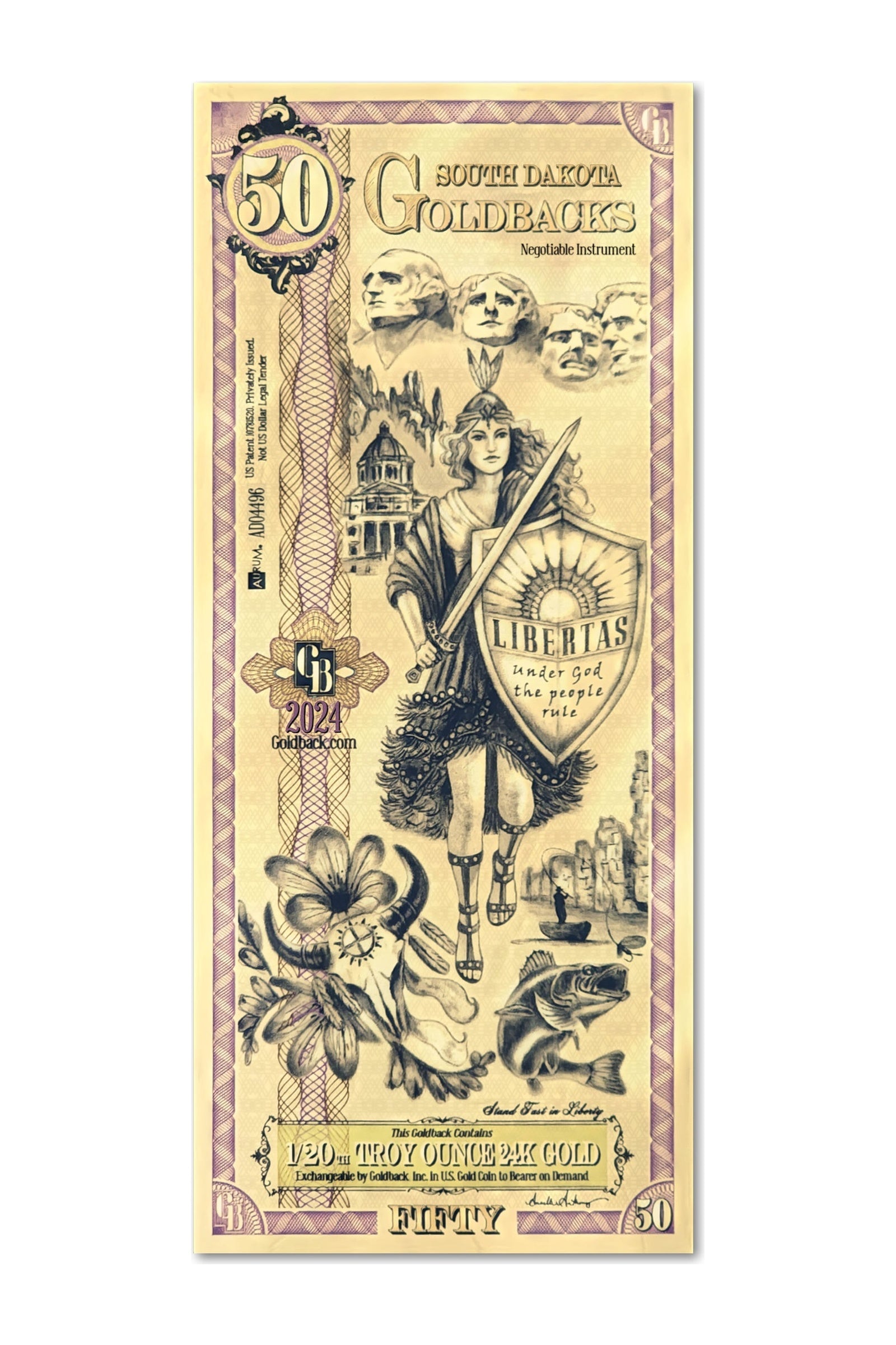 La virtud suprema de la serie de Dakota del Sur, Libertas , adorna la denominación 50 Goldback con su presencia. Inspirada en la icónica estatua de la Dama de la Libertad en Washington DC, Libertas se alza con una espada desenvainada y un escudo en alto, simbolizando su compromiso inquebrantable de defender sus principios.
