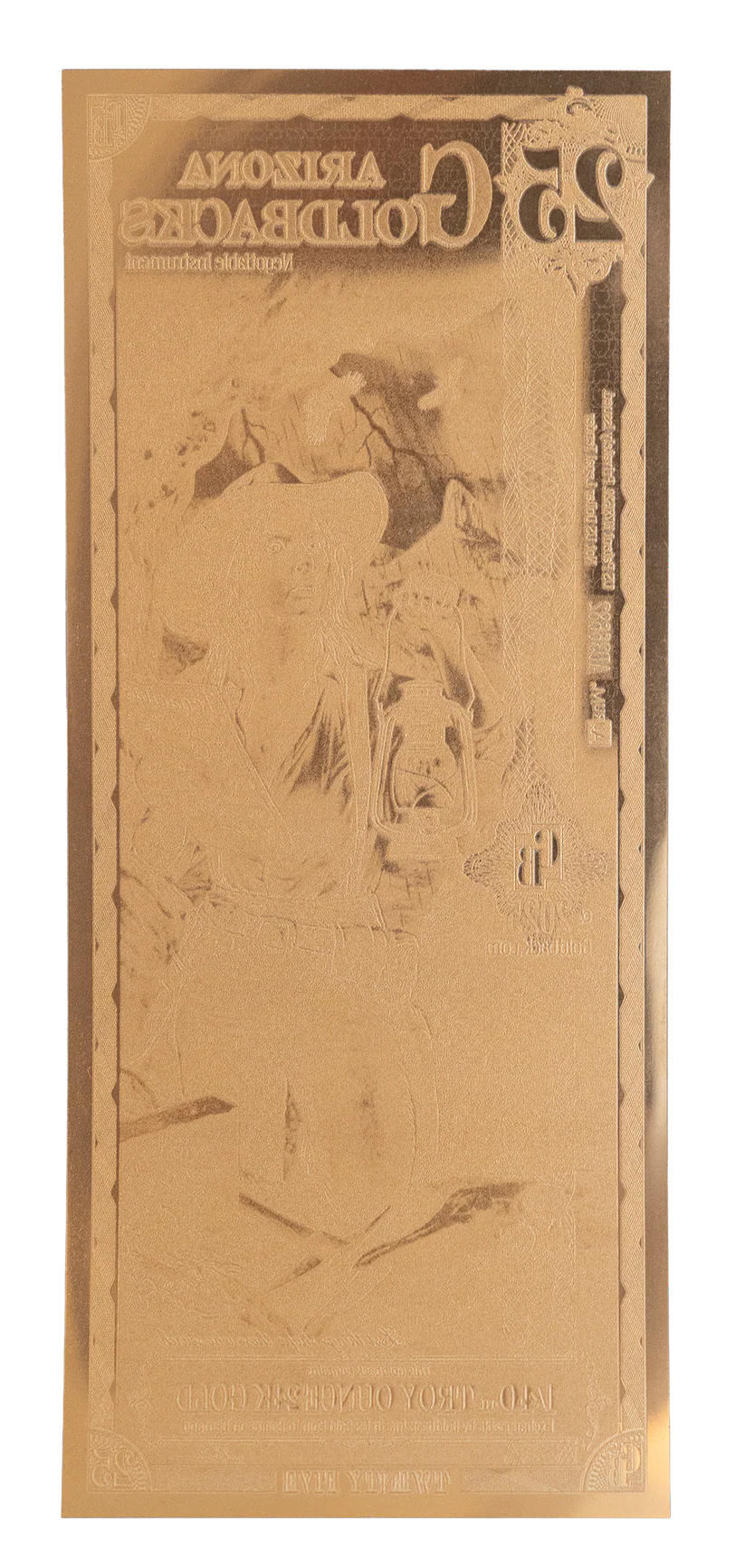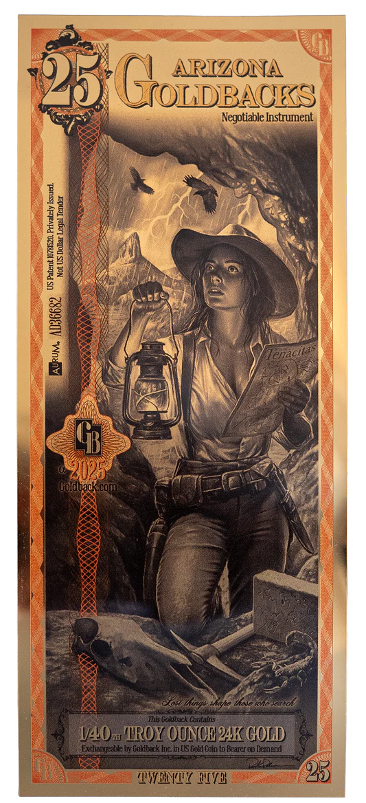 The Arizona 25 Goldback contains 1/40th of a troy ounce of 24-karat gold and is part of the world’s first voluntary, spendable gold currency. Combining historical lore, artistic craftsmanship, and intrinsic value, this note is perfect for collectors, investors, and anyone captivated by Arizona’s adventurous spirit.