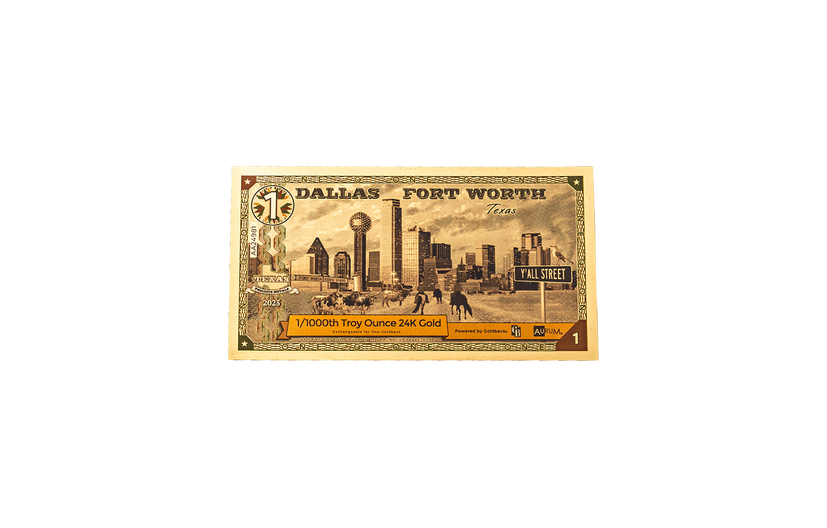 Unlike traditional paper currency, each Goldback contains actual, spendable gold, sealed within a durable polymer note using advanced technology. The Dallas One features intricate artwork inspired by Texas heritage and the spirit of Dallas, making it both a functional form of sound money and a collectible piece of modern numismatic art.