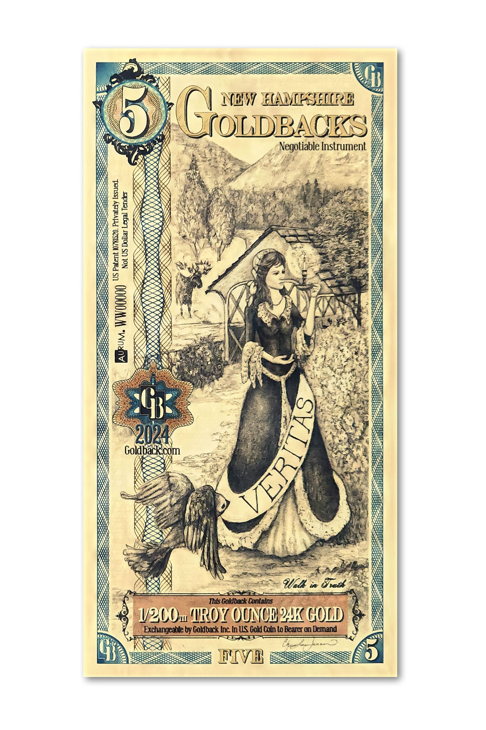 The New Hampshire 5 Goldback features Veritas, the virtue of Truth, in colonial attire extending the light of a candle along a path that leads to a covered bridge over a foggy river. The covered bridge echoes those along New Hampshire's scenic Kancamagus Highway, a passage through uncertainty toward clarity. The state flower, the purple lilac, and the state bird, the purple finch, accompany her. A moose stands in the distance, steady and watchful. Truth does not shout. She carries a candle and walks forward. Inscribed in the artwork: "Walk in Truth."